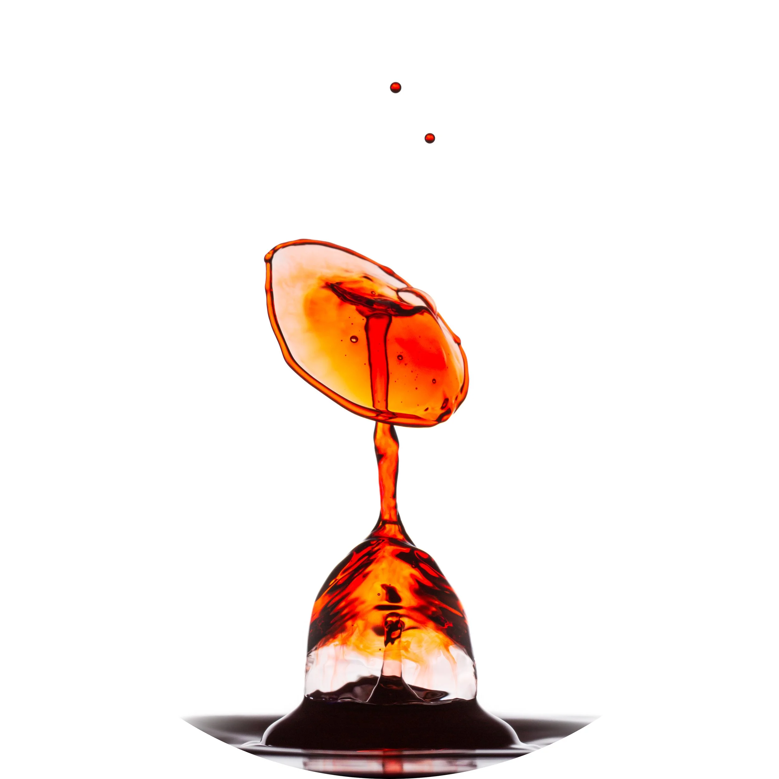 The Parasols are high-speed photographs of colliding drops of liquid. This type of photography presents a number of technical challenges starting with the type, viscosity, and color of the liquid being used, the sizes of and timing between drops used to produce the collisions, and with timing the precise instant at which the image is recorded. Small changes in the sizes of the droplets or the milliseconds between drops make a world of difference in the result. Yes, I said milliseconds.